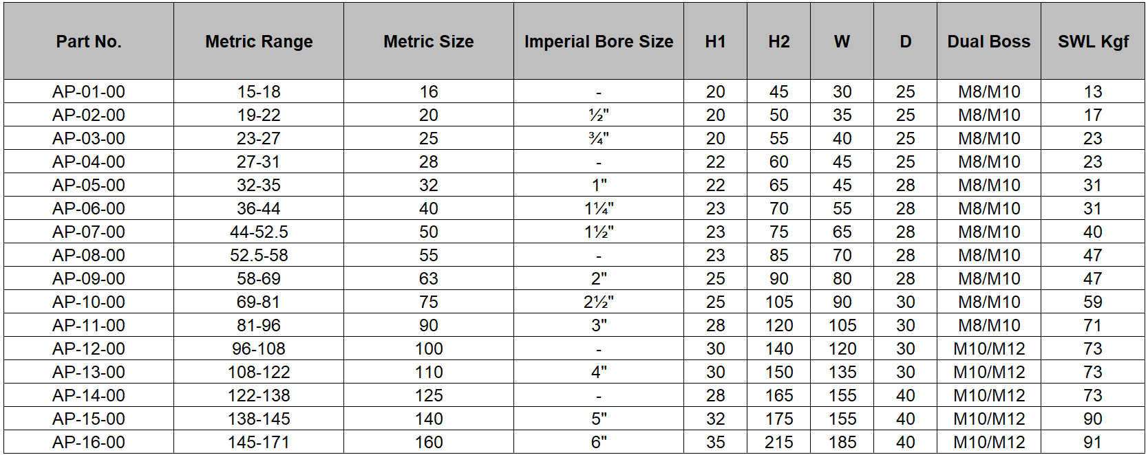 Please see the all the sizes of the complete line of Apache Pipe Clamps.